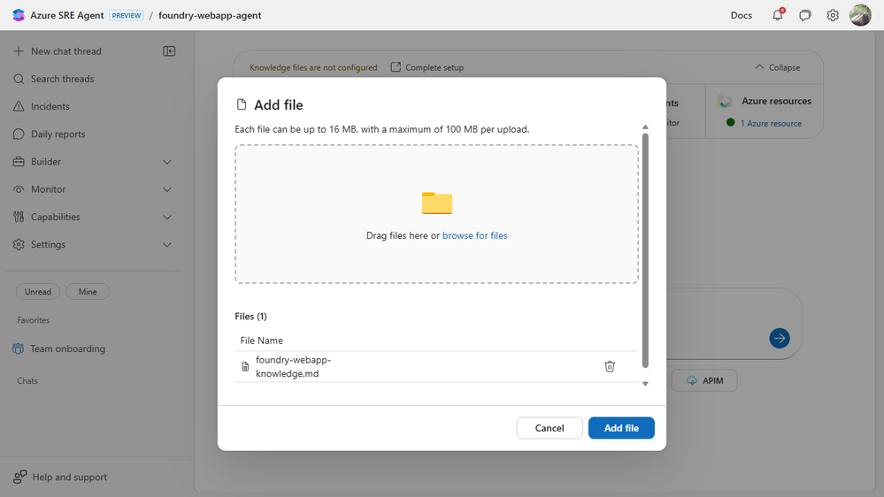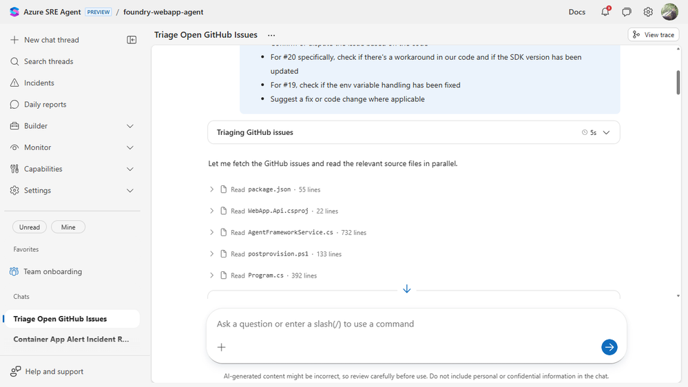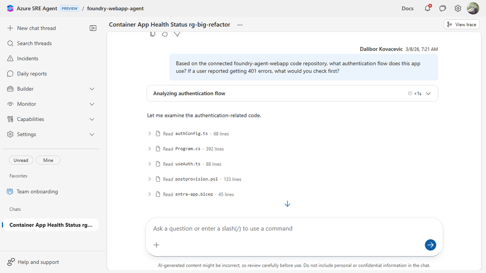 So for the March 10 GA release, we rebuilt onboarding around a more practical bar: can a new agent become useful on day one? To test that, we used the new flow the way we expect customers to use it. We connected a real sample app, wired up live Azure Monitor alerts, attached code and logs, uploaded a knowledge file, and then pushed the agent through actual work. We asked it to inspect the app, explain a 401 path from the source, debug its own log access, and triage GitHub issues in the repo.