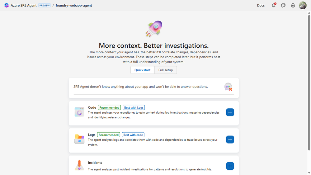 We rebuilt onboarding around a simple question: after setup, can SRE Agent help with a real app on the same day? This post shows the full setup so you can see what good looks like, but not all steps are required upfront.