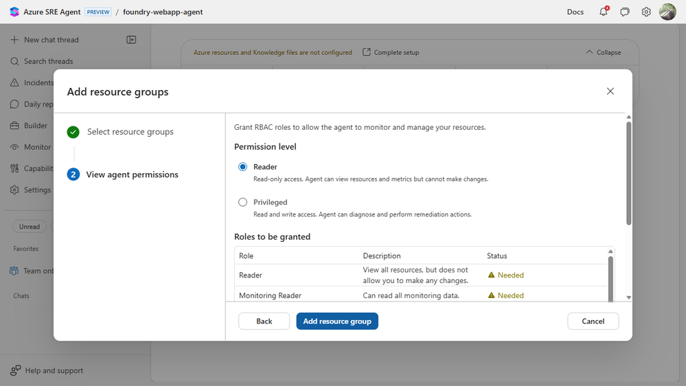 We scoped it to the resource group that contained the sample Container App. The wizard then set the roles the agent needed to observe and investigate the environment.