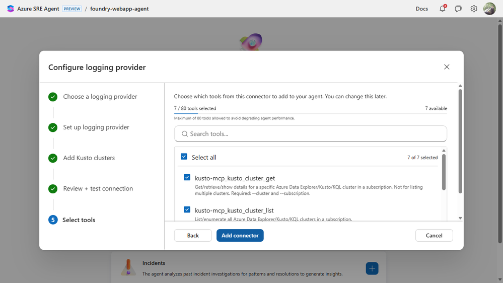 The wizard supports Azure Kusto, Datadog, Elasticsearch, Dynatrace, New Relic, Splunk, and Hawkeye. After choosing Kusto, it generated the MCP connector settings for us. We supplied the cluster details, tested the connection, and let it discover the tools.