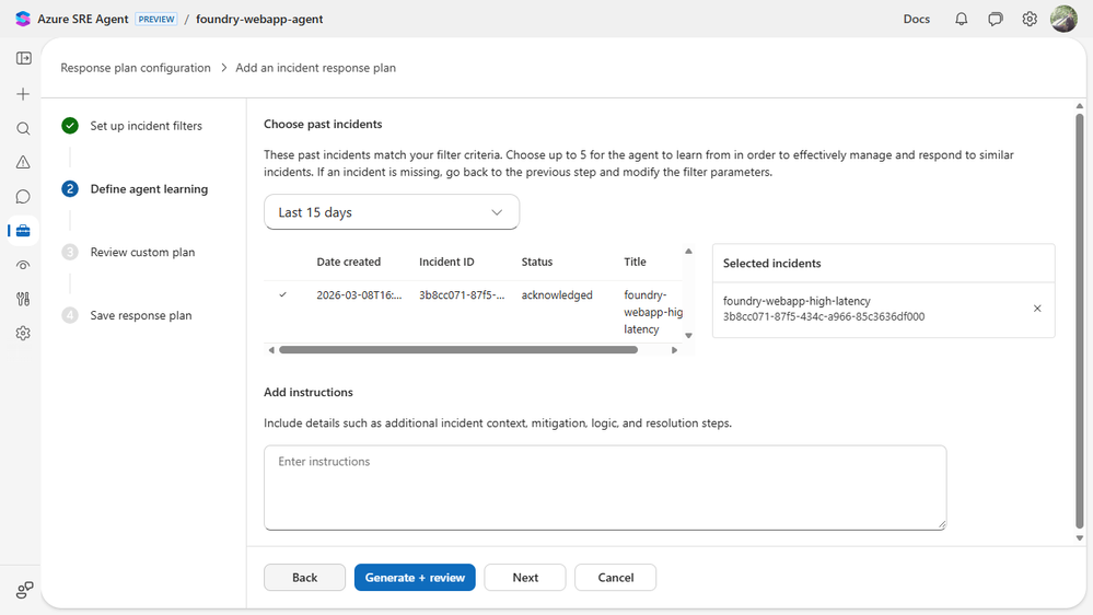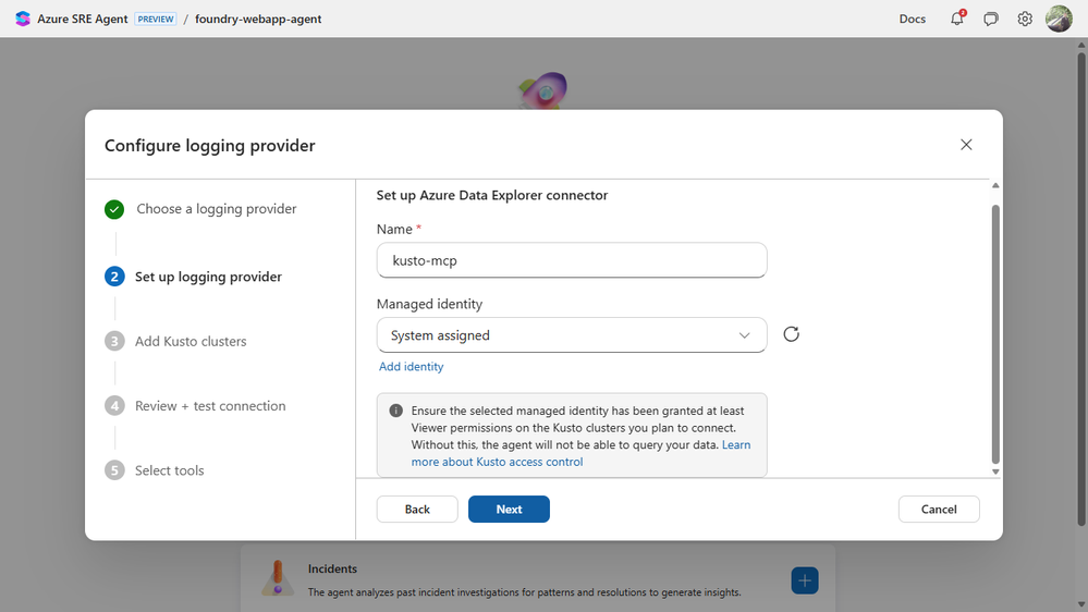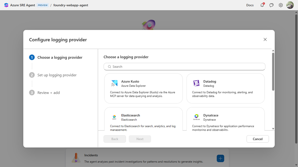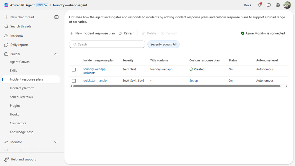 This part is simple by design. If incidents are where the agent proves its value, connecting them should feel like the most natural part of setup, not a side quest. PagerDuty and ServiceNow work too, but for this walkthrough we kept it on Azure Monitor so we could wire real alerts to a real app.