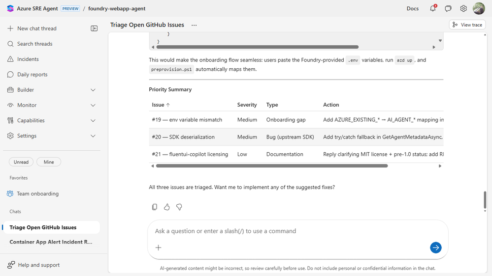 Confirmed, medium severity. The agent traced the problem to metadata handling in AgentFrameworkService.cs and suggested a safe fallback path. - Issue #19, Create Preview experience from AI Foundry is incomplete