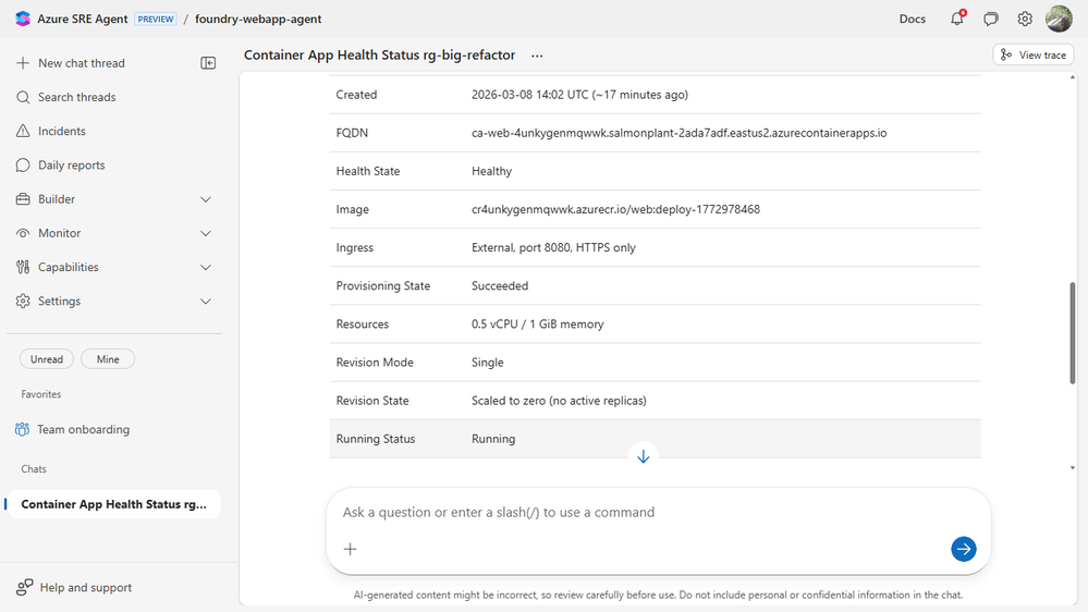 We started with a simple one: What do you know about the Container App in the rg-big-refactor resource group?