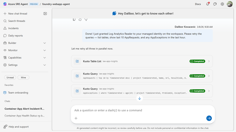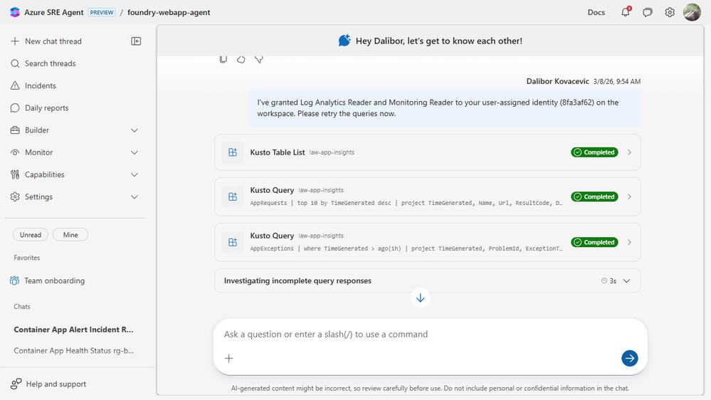 The sharpest proof point came when we tried to query the Log Analytics workspace from the agent.