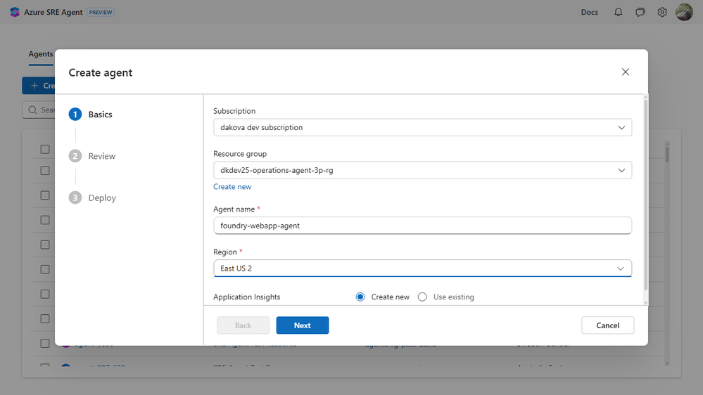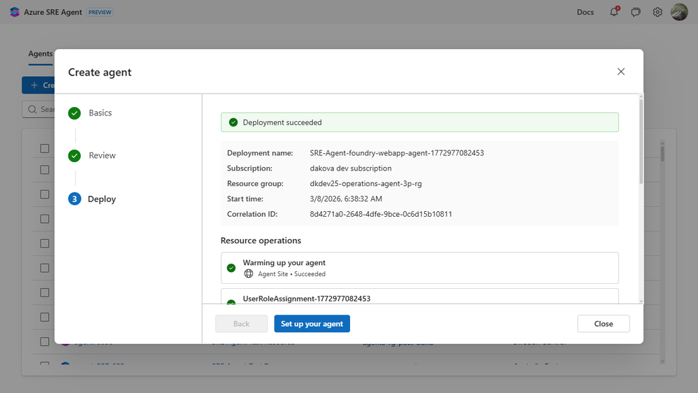 Starting March 10, you can create and configure an SRE Agent at sre.azure.com. Here is what that looked like for us.