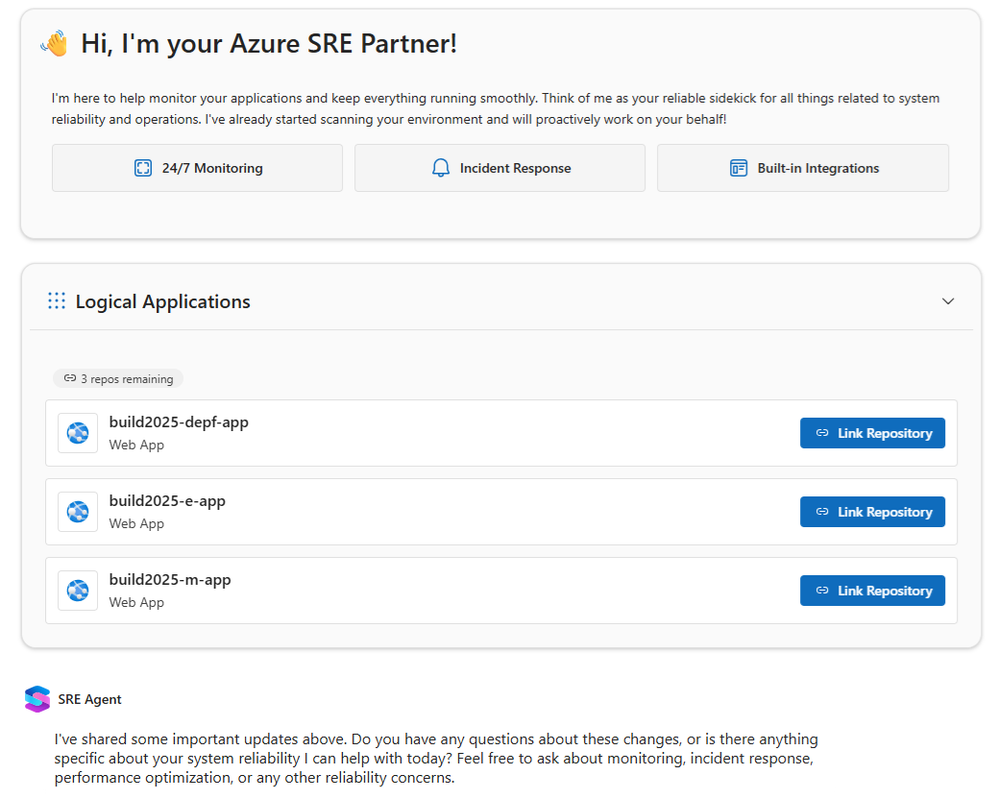 One of the big announcements at Build this year was the Agentic DevOps announcement, which includes the new Azure SRE Agent. Designed to empower Site Reliability Engineers (SRE), the SRE Agent is a new agentic service that can manage Azure application platform services. including App Service, Functions, and Azure Container Apps to name just a few. It provides automatic incident response and mitigation, faster root cause analysis (RCA) of production issues, and continuous monitoring of application health and performance. With SRE Agent, you can use a natural language interface for managing your web applications on Azure App Service.