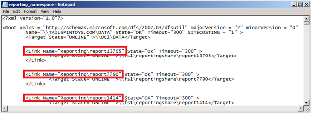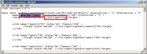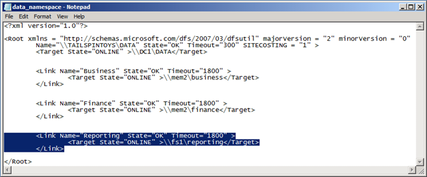 Replace the "Name" element of the standalone namespace with the name of the domain-based namespace and replace the "Target" element to be the UNC path of the domain-based namespace server (the one you will be configuring later in step 6). Below, I highlighted the single " \\FS1\reporting " 'name' element that will be replaced with " \\TAILSPINTOYS.COM\DATA ". The single " \\FS1\reporting " element immediately below it will be replaced with " \\DC1\DATA " as "DC1" is my namespace server.