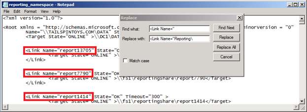 One trick is to utilize the 'replace' capability of Notepad.exe to search out and replace all instances of the '<Link Name="' string with '<Link Name="folder\' ('<Link Name="Reporting\' in this example). The picture below shows the original folders defined and the 'replace' dialog responsible for changing the names of the folders (click 'Replace all' to replace all occurrences).