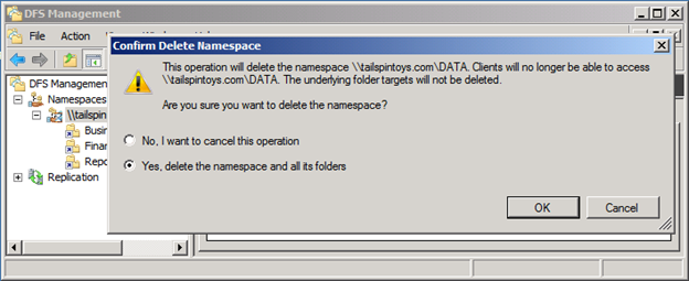 These operations should be performed during a maintenance window. The length of which is dictated by your efficiency in performing the operations and the length of time it takes to import the DFS namespace export file. Because a namespace is so easily built, modified, and deleted, you may wish to consider a "dry run" of sorts. Prior to deleting your production namespace(s), create a new test namespace (e.g. "DataTEST"), modify your standalone namespace export file (Step 2) to reference this "DataTEST" namespace and try the import. Because you are using a separate namespace, no changes will occur to any other production namespaces. You may gauge the time required for the import, and more importantly, test access to the data ( \\tailspintoys.com\DataTEST\Reporting\Reporting8000 in my example). If access to the data is successful, then you will have confidence in replacing the real domain-based namespace.