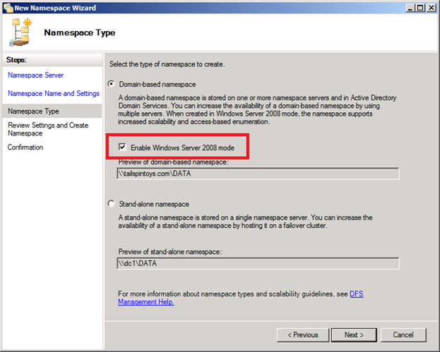 " Windows Server 2008 mode " namespaces allow for domain-based namespaces of many thousands of DFS folders per namespace (look here for scalability test results). With many Active Directory deployments currently capable of supporting 2008 mode namespaces, Administrators are wishing to remove their dependency on the standalone namespaces and roll them up into a single domain-based namespace. Doing so will improve referral performance, improve fault-tolerance of the namespace, and ease administration.