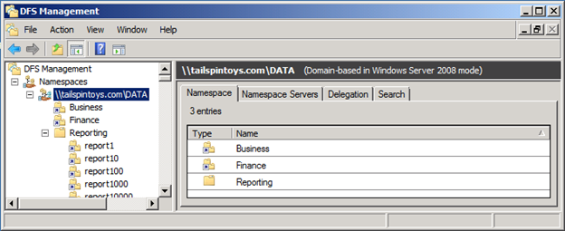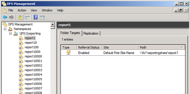 Standalone Namespace "Reporting" hosted by server "FS1" and has 15,000 DFS folders:
