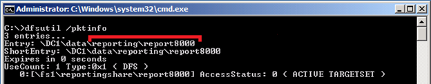 Referral cache confirms the new namespace structure (red line highlighting the name of the DFS folder as "reporting\report8000"):