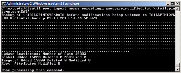 dfsutil root import merge reporting_namespace_modified.txt \\tailspintoys.com\DATA