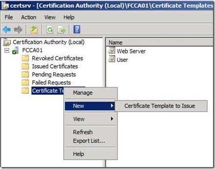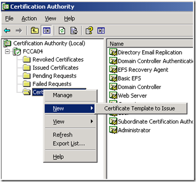 6. Log on to the Windows Server 2003 CA, and open the Certificate Authority Snapin (Certsrv.msc), and right click on Certificate Templates, and select New , then Certificate Template to Issue from the context menu.