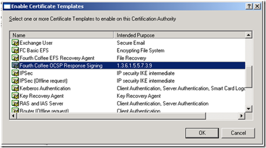 If you plan on using a Windows Server 2003 Enterprise CA to issue the OCSP Signing Certificate you will need to follow the instructions outlined in the previous section for enabling the use of custom extensions.