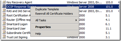 3. Right click on OCSP Response Signing Template, and select Duplicate Template from the context menu, as illustrated below:
