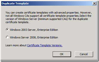 4. From the Duplicate Template dialog box, select Windows Server 2003 Server, Enterprise Edition , and click OK . Selecting Windows Server 2003 Server, Enterprise Edition , creates a Version 2 Template instead of a Version 3 Template.