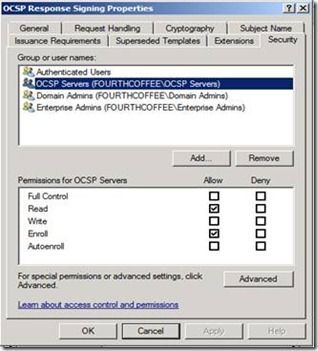 3. On the Security Tab, add the hostname of the soon to be OCSP Server, and give the server Read and Enroll permissions to the template. Note: A more scalable solution, as seen in the illustration below, is to create a security group, assign permissions to the security group, and add any OCSP servers to the Security Group.