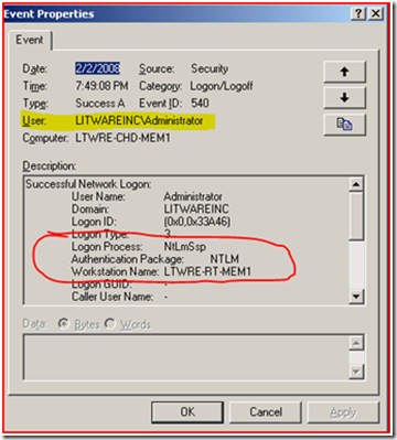 Notice how the user that authenticated to the server is the “LITWAREINC\Administrator” account. It used NTLM authentication and the source machine name is LTWRE-RT-MEM1.