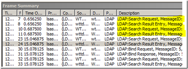 The first set of traffic that we see is a couple of LDAP Search Requests and Search Responses. You can see this in the Description field of the Frame Summary:
