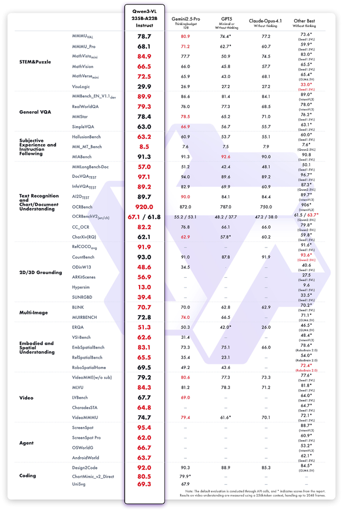 Overall, the largest mixture-of-experts Qwen3-VL-235B-A22B-Instruct achieves top performance on most metrics among non-reasoning models, significantly outperforming closed-source models such as Gemini 2.5 Pro and GPT-5, while also setting new state-of-the-art results among open-source multimodal models, demonstrating its strong generalization ability and comprehensive performance on complex visual tasks.