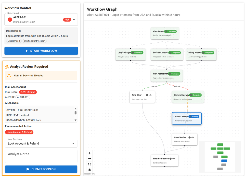 This part is entirely non-AI — it provides the predictability, traceability, and governance that enterprise workflows require. If a case is high-risk, the system checkpoints and pauses for human review. Once an analyst approves or rejects the recommendation, the workflow resumes from the checkpoint and completes. The deterministic layer ensures that every decision path is reproducible and logged, making the system both intelligent and auditable.
