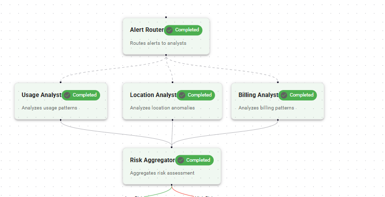 Alert Router: The Alert Router is the entry point of the workflow. When a new alert arrives — for example, multiple login attempts from different countries or a sudden spike in transactions — the router initiates the workflow and distributes the work across multiple agents in parallel. It encapsulates: