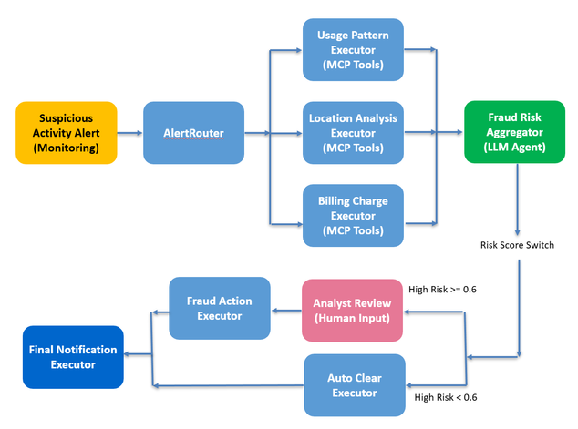 In fraud detection, this means the workflow orchestrates the process end-to-end, while specialized agents bring contextual understanding of usage patterns, location anomalies, and billing irregularities. Each part does what it’s best at: