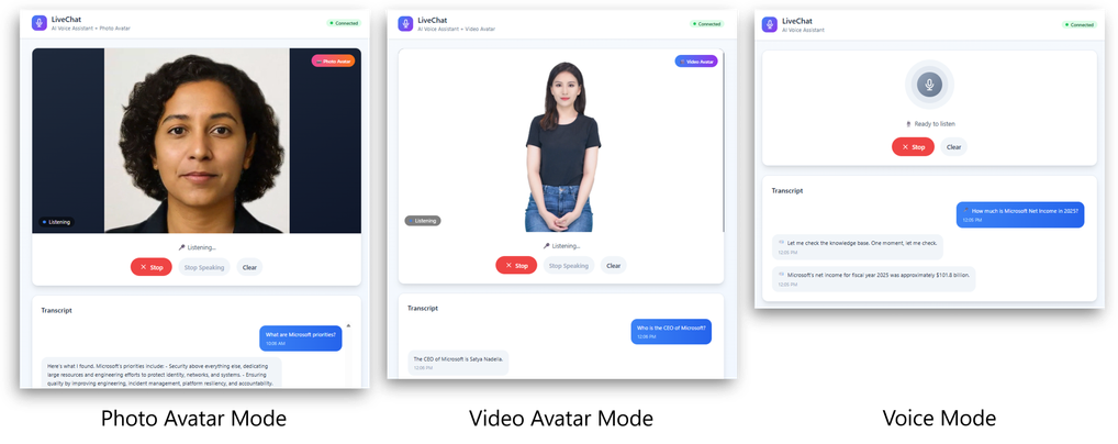 The solution exposes a web‑based interface where users can speak naturally to the AI agent using their voice. The agent responds in real time using synthesized speech, while live transcriptions of the conversation are displayed in the UI to improve clarity and accessibility. To help compare different interaction patterns, the sample application supports three modes: 1) Photo Avatar mode, which adds a lifelike visual presence. 2) Video Avatar mode, which provides a more immersive, full‑motion experience. 3) Voice‑only mode, which focuses purely on speech‑to‑speech interaction.