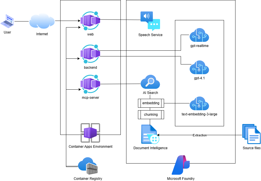 - Azure OpenAI — provides the Realtime API for speech‑to‑speech interaction in the voice‑only mode and the Chat Completions API used by backend services for reasoning and conversational responses.