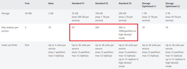 Figure 2: Part of the Cognitive Search tier breakdown. Highlights different index limits.