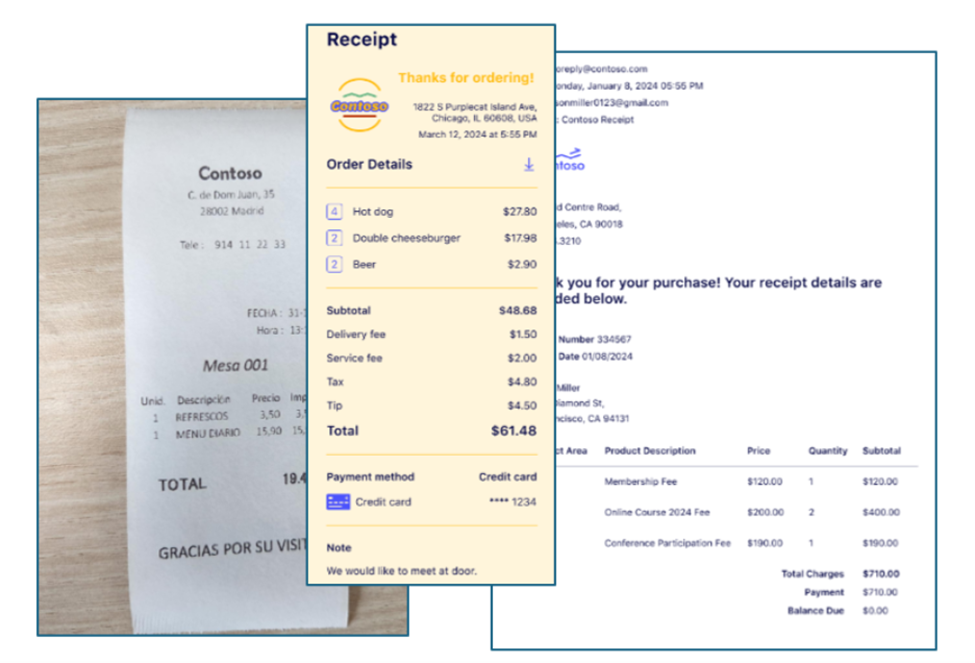 Your business processes the same logical document type – say, receipts – but they arrive in wildly different formats. A restaurant receipt has a simple, tabular layout. A food delivery receipt has detailed line-item breakdowns with fees and tips. An email confirmation for an online subscription looks nothing like either one.