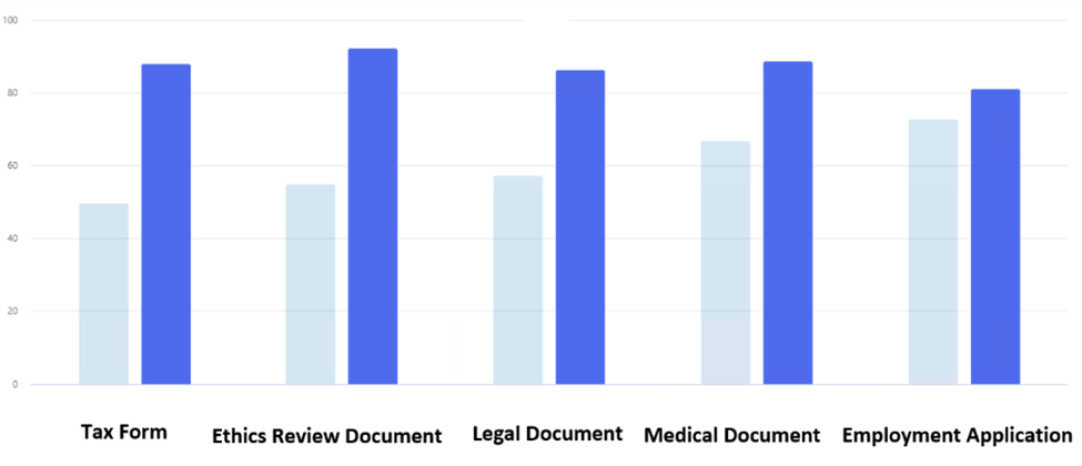 We evaluated CU’s analyzer across 45 documents spanning five real-world categories: tax forms, ethics review documents, legal documents, medical documents, and employment applications.