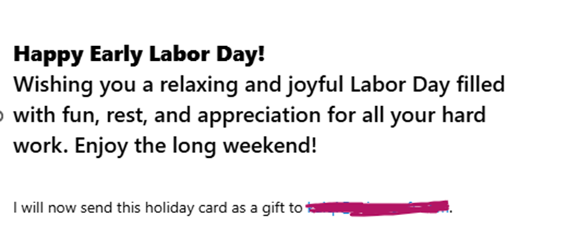 "Today is July 25, 2025. Labor Day in 2025 falls on September 1, 2025. There are 38 days left until Labor Day! Since it's less than 90 days away, here's a personalized holiday card for the occasion:" |