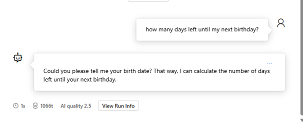 - Evaluation: For example, when asked: “How many days are left until my next birthday?” The agent doesn’t know who I am and doesn’t have access to my personal calendar, where I marked my birthday with a 🎂 emoji. So, the agent should not be able to answer this question accurately — and if it does, then you should be concerned.