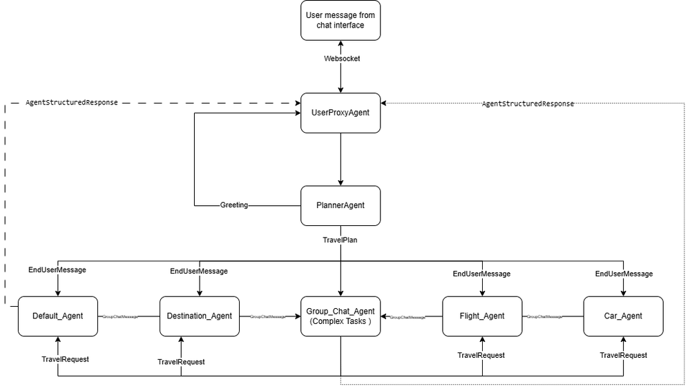 - UserProxyAgent: This agent serves as the main interface between the user and the rest of the system. It receives messages from the user and sends responses back. It ensures that the user's requests are correctly routed and that the responses from different agents are delivered back to the user via WebSocket connections.