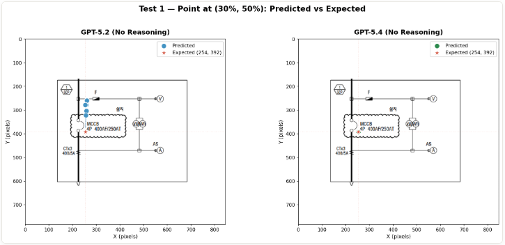 When I first ran these tests against GPT-5.2, the results were mixed — good enough to be promising, but inconsistent enough to leave clear room for improvement. I tried many workarounds: feeding image dimensions explicitly, overlaying coordinate grids, enabling extended reasoning, and building iterative self-correction loops. Each helped, but required deliberate engineering effort. Then GPT-5.4 was released. Re-running the same benchmark revealed that most of those workarounds were no longer necessary.