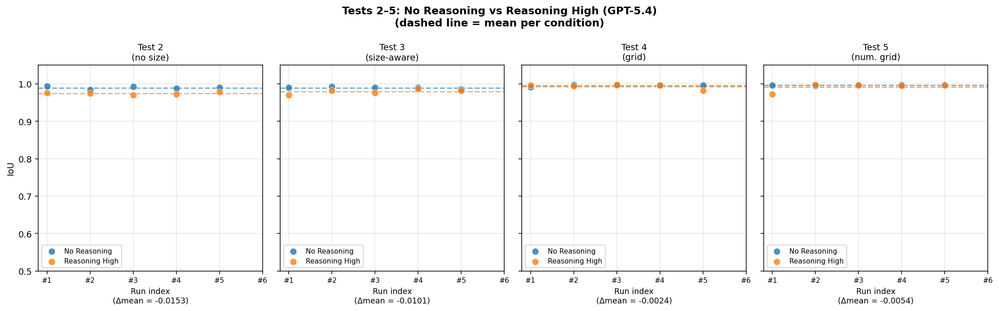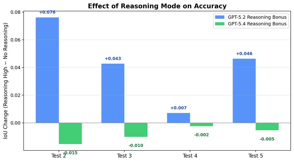 For GPT-5.4, reasoning mode offered no additional benefit on this class of task. The base model already achieves 0.99+ IoU, so there was simply no room for improvement. In a few cases the reasoning runs showed marginal regressions (−0.005 to −0.015), likely within noise. The takeaway isn't that reasoning mode is harmful in general, but rather that a spatial-coordinate task at this complexity level doesn't require it when the underlying model already has strong coordinate understanding.