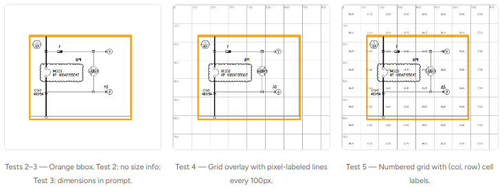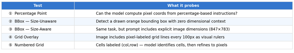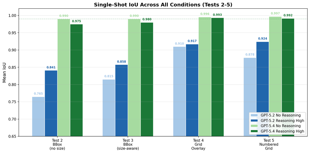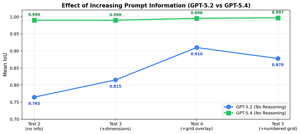 - Grid overlays & image dimensions in prompt — Gave +0.05–0.15 IoU for GPT-5.2. Not needed for GPT-5.4 (already ≥0.99 without it).