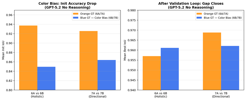 For GPT-5.4: Color bias has no measurable effect. All variants (6A/6B/7A/7B) hit 0.994–0.998 IoU on iteration 1 regardless of color assignment.