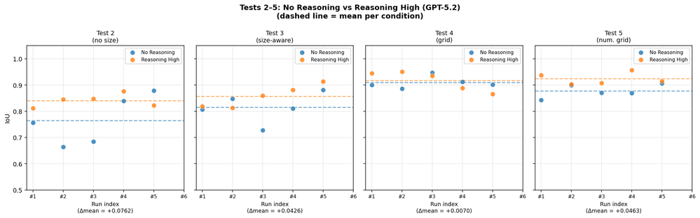 For GPT-5.2, enabling extended reasoning (reasoning: high) provided a meaningful boost — especially when the prompt was sparse. On Test 2 (bare image, no spatial context), reasoning added +0.076 IoU and visibly tightened the spread of results across runs. As prompts got richer, the benefit shrank: with a grid overlay (Test 4), reasoning added only +0.007. In other words, reasoning mode acted as a compensating mechanism — filling in the gaps when the prompt alone didn't provide enough spatial scaffolding.