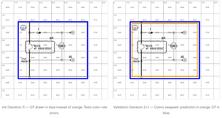- Color convention management — GPT-5.2 showed color bias (−0.09 IoU when colors swapped). No effect on GPT-5.4.