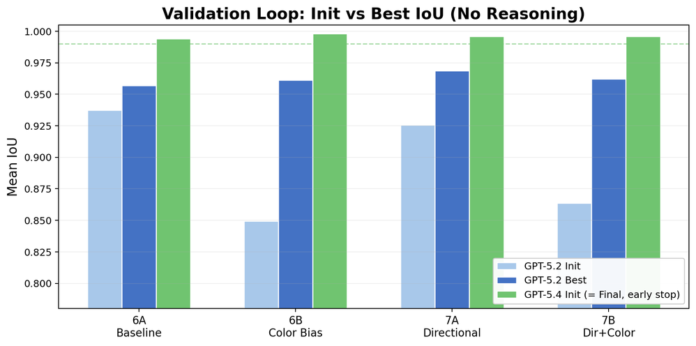- Extended reasoning mode — Gave +0.04–0.08 IoU for GPT-5.2. No benefit for GPT-5.4 on this task (already at ceiling without it).