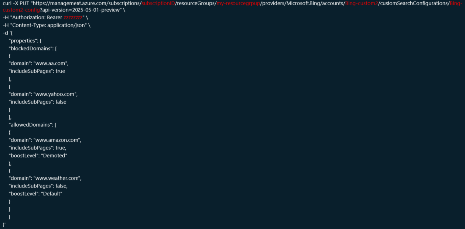 In this step, you can configure Bing inclusion and exclusion list. Below is an example of create-update-config.REST.