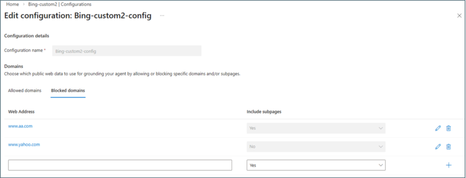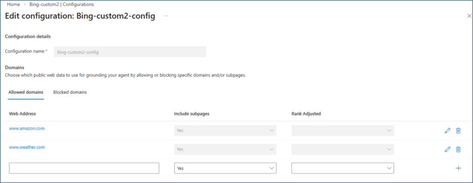 Bing configuration Bing-custom2-config is created in Azure portal, with the configured allowed and blocked list.