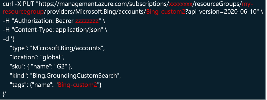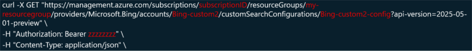 In this blog, we particularly give examples on “Grounding with Bing Custom Search”. There are approaches introduced to follow the ARM method: 1>REST API; 2> Python or C# SDK.