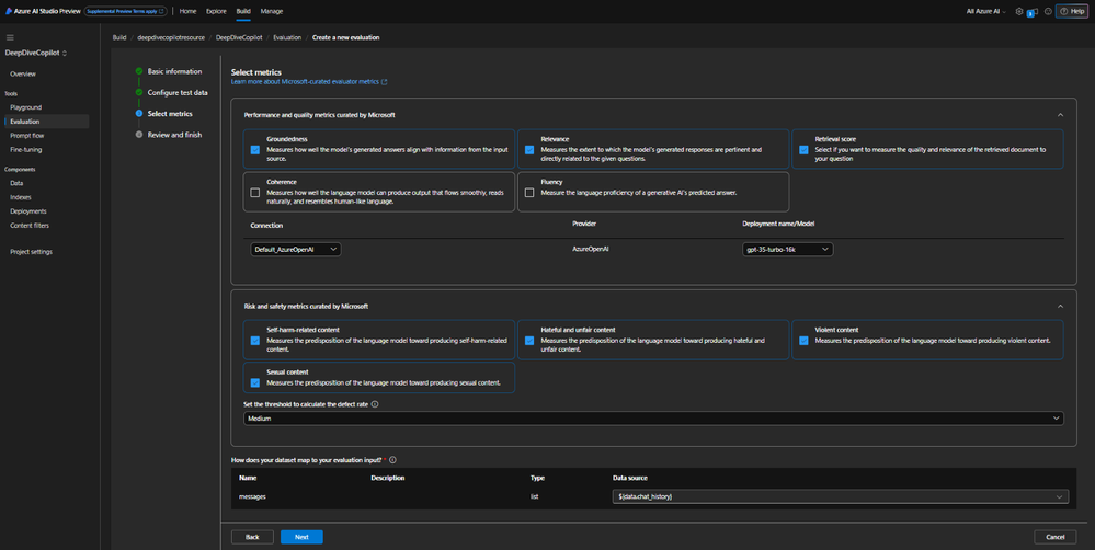 7. Under Select Metrics RAG metrics are automatically selected based on the scenario you have chosen. Refer to more details of metrics. Choose your Azure OpenAI Service instance and model and click on Next.