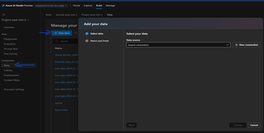 2. Add test data to Azure AI Studio: In your AI Studio project, under Components, select Data -> New data.