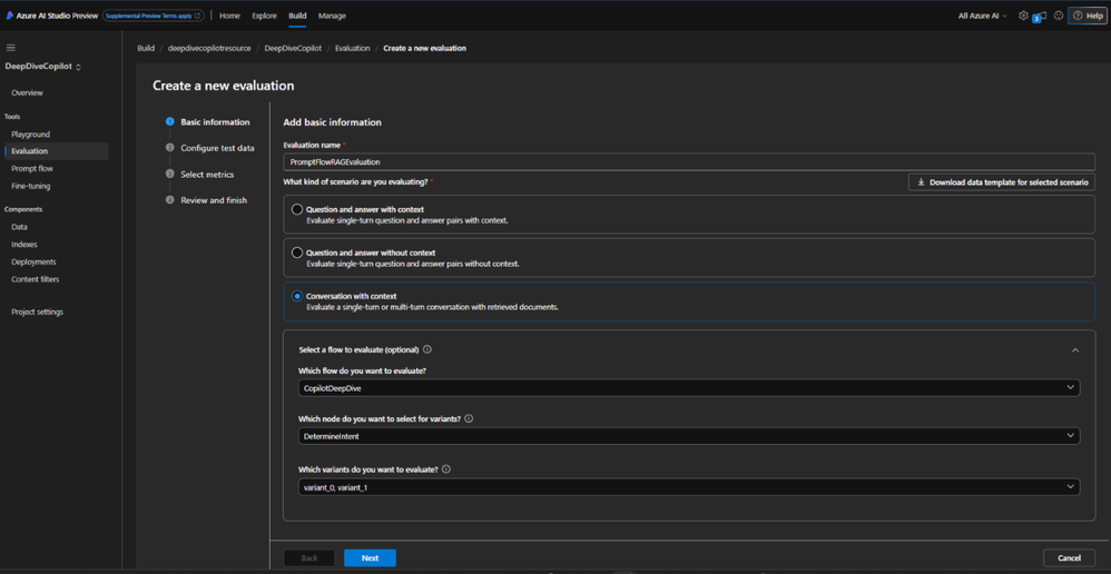 5. Evaluate the flow: Under Tools -> Evaluation, click on New evaluation. Choose Conversation with context and select a flow you want to evaluate. Here we are testing two variants of prompt: Variant_0 and Variant_1. Click on Next.