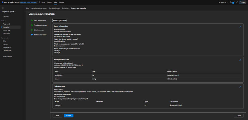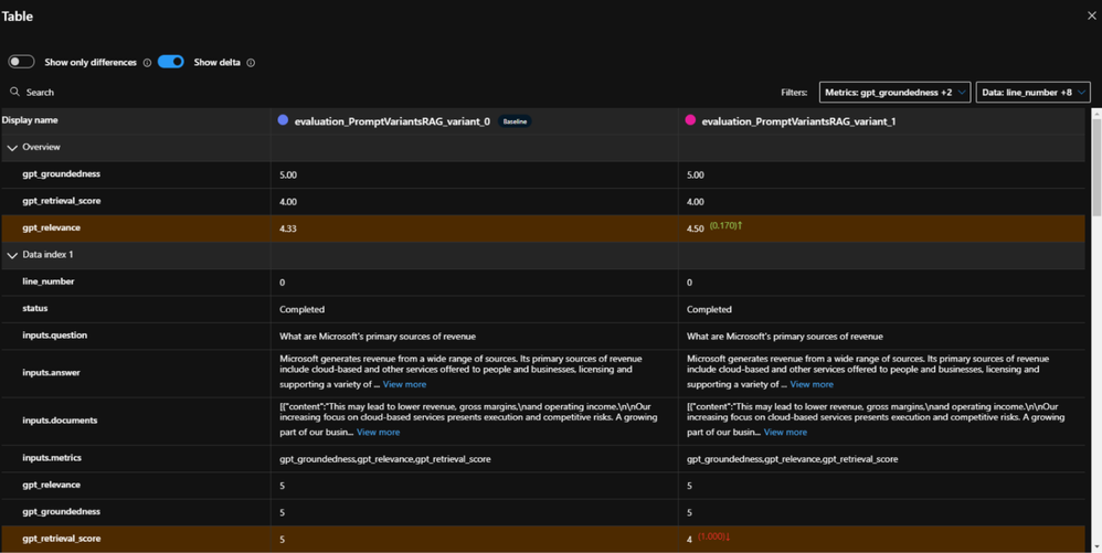 In this section, let’s walk through the step-by-step process of testing RAG using prompt variants with the prompt flow using metrics such as groundedness, relevance, and retrieval score.